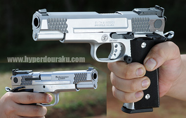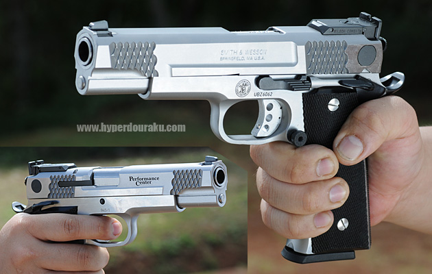 アメリカS&W社が開発したコルトガバメントクローン。その性能は本家をも凌ぐとか。スライド右側面を見るとわかるがエキストラクターが外装式になっている。弾薬は.45ACP。