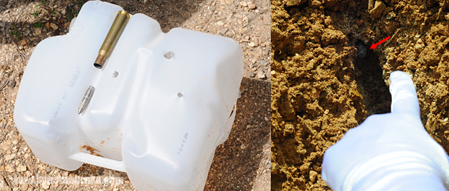 バックストップに突き刺さった12.7mmの弾頭を発見!! 掘り起こす。