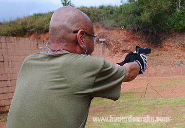 続いて.380ACPのSIG P232を撃つ。スーツにP232、まるでドラマ「SP」のよう。