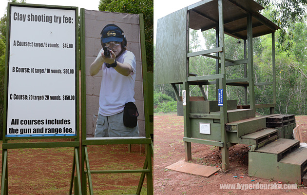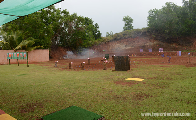 シューティングレンジは風通しが良くて広々している。この日はしばしばスコールに見舞われたが、レンジには屋根があるので一般の射撃には差し障りはない。
