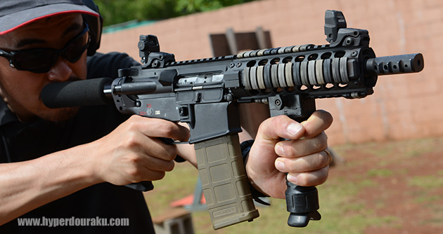M4系レシーバーにショートバレルというスタイル。ストックレスなのでピストル扱いになり、ショートバレル独特の迫力あるマズルフラッシュが楽しめる。気分はまるで映画「ヒート」のアルパチーノかデニーロだ!!