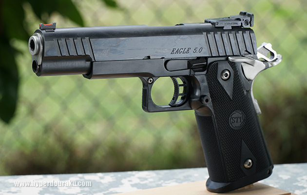 STIイーグル5.0。口径は9mm。KSC製ではなくて実銃。カッコいいなぁ。 シューティングに使用するなら多弾数で反動が.45口径に比べて小さい9mmが人気。