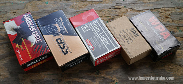 弾もその時々でいろいろな種類が入荷されるのが面白い。今回は9mmルガー弾だけでもこんなに種類が豊富だった。左からFEDERALのアメリカンイーグル115gr、Blazer Brassの115gr、Aguilaの124gr、IMIの115gr、WPAの115gr。弾頭重量の違いで、撃ち比べたりするのもマニアック。