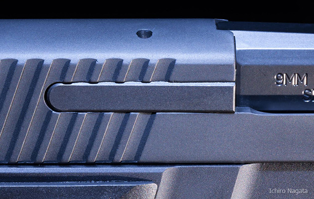 多くの拳銃は、角がカッチリと立っているものですが P226系には曲面が多用されています。スライドのフェイスから上面、そして後ろの方まで丸みがあるのです。