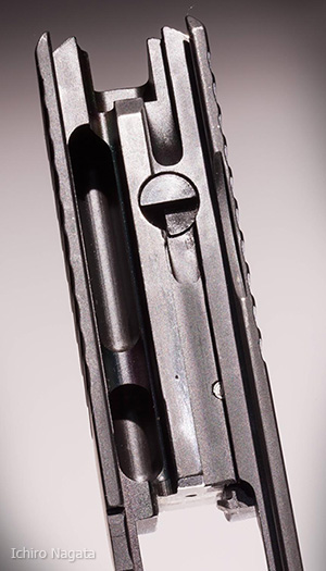 で、エクストラクターというのはカートリッジをくわえる役目上、カートの有無を知らせてくれるインディケイターの役もします。このフォトではイジェクション ポートに近い部分がちょっとセリ上がっています。これはチェンバーにカートが入っているという知らせなのです。
