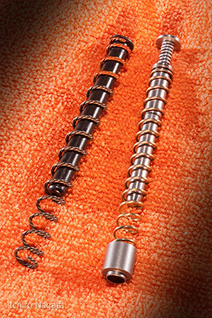 拳銃は発射のたびにスライドとフレイムがガツンガツンと当たるので、やがてはヒビが入るとかして寿命がきます。でもこのスプリングを入れるとスライドを強く引いても金属同士がぶつかる感触はなくフッと止まるのです。こりゃテッポが長持ちするんだろな~、という実感があるんです。値段は90ドルほどもしますが、ワシのSAOには4挺ともに入れてあるんです♪