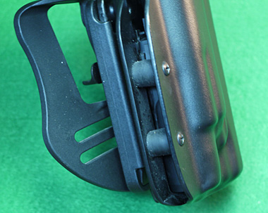 これら樹脂製ホルスターの最大の特徴は、先に述べましたようにメインアーム(プライマリィウエポン)からサイドアーム(セカンダリィウエポン)へ、またその逆を行なった際にハンドガンを素早く抜け、そして簡単にホルスターに戻す事が可能な点です。