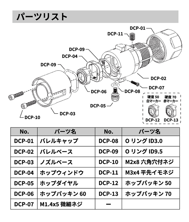 ニトリルゴム(NBR)製のホップパッキンは、0.2g~0.3gのBB弾に対応。インドアからアウトドアフィールドまで幅広く使用できます。パッキンの硬度はショアA50/60/70が付属、気温やBB弾に合わせた硬度セッティングが容易です。