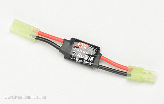 7.4Vのリポバッテリー専用のセーフティーデバイス。バッテリーと電動ガンの間にコネクトすることで、バッテリー電圧が6.5v以下になると送電を停止し、バッテリーを保護する。収納スペースに余裕があればセットしておきたいデバイスだ。