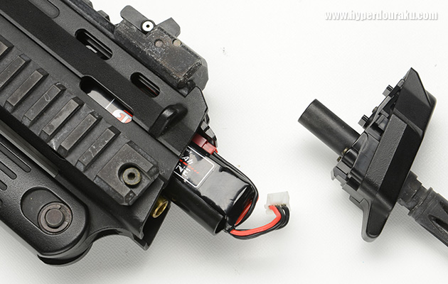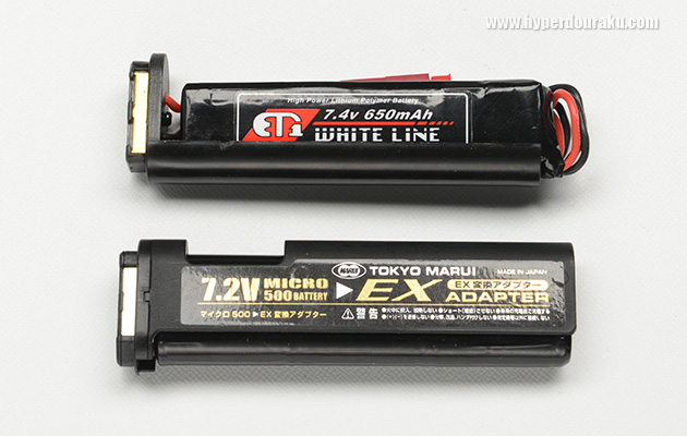 東京マルイ純正の7.2V マイクロ500ニッケル水素バッテリー+EX変換アダプターに比べ、リポバッテリーのほうが圧倒的にトリガーレスポンスが良いのでぜひ一度試してほしい。