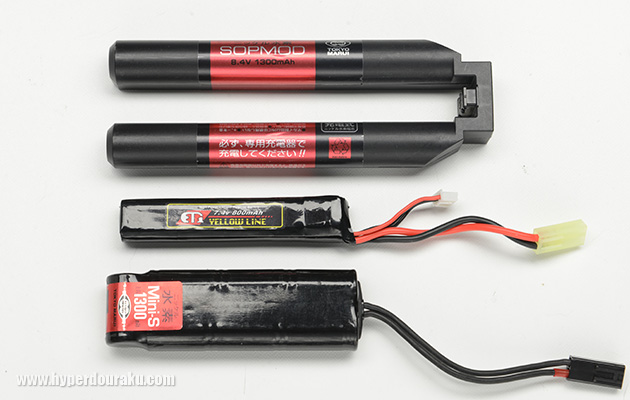 オレンジラインの1400mAhよりも短く太い。また、SOPMODバッテリーよりも短いが、マルイのM4 SOPMODのクレーンストックには太すぎて入らなかった。