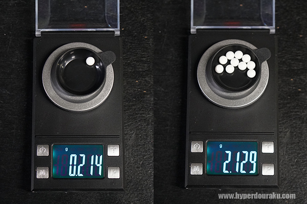 ただ、気になった点としてはすべての重量が同じ白色であることだ。メーカーの説明によると染料を使用することで生分解時間が増えてしまったりコスト増になるといった理由で着色はしていないそうなのだが、フィールドによってはダークアースカラーでないと使用できないところもある。弾を混用したときの識別にもなるので、使用者視点からすると重量ごとに薄く色がついていると良かったと思う。
