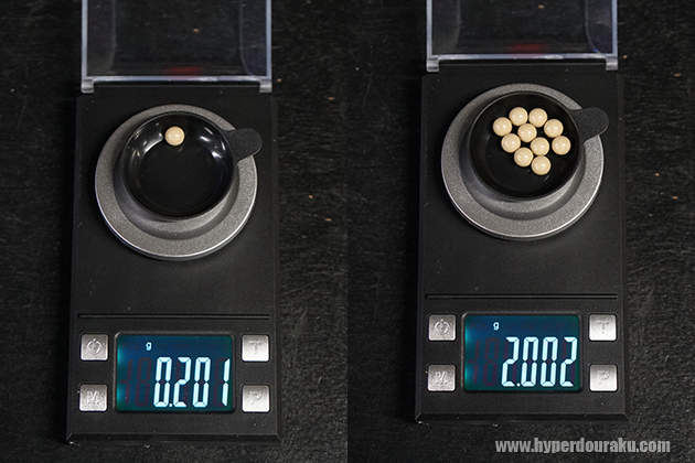 参考までに「東京マルイ/ベアリングバイオBB弾0.2g」の実測データ。