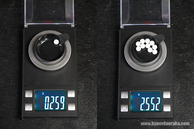 精密デジタルスケールでの計測結果。平均値は0.255gに近い、やや重めか。