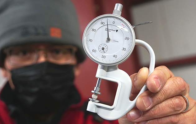 「ヘア・マイクロキャリブレーター」実測は「5.943mm」。無作為の10発、更に1発毎に挟む箇所を数回変えての実測値は「5.941〜5.946mm」と、3種の中では最も小さめだった。とはいえ「2〜3/1000mm」という超微細な差だ。