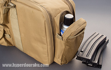 M249ガンケースの両サイドに1個づつ、さらに全面に3カ所にポケットを装備。両サイドにはM4マガズィンが3本、またはガス缶が楽々収納できるサイズ。全面の横長ポケットにはBB弾をはじめBBボトルやバッテリー、オイルやバレルクリーニングロッドなどの各種メンテナンス用品までを収納。さらに幅広ポケットはフルサイズのハンドガン……それもスコープ付の状態で収納可能。な〜んと、サバゲに必要なガン関係のアイテムが、まとめて収納できるんです!