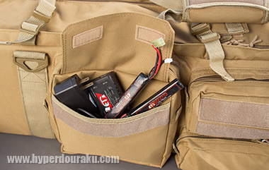 前面には上下2段に横長のポケットが二つ。BB弾やマガズィン、バッテリーや充電器、メンテナンストゥールが収納可能。