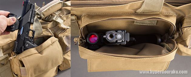 なんとダットサイト付きのハンドガンまでスッポリ収納できる。サバゲに必要なエアソフトガン一式がまとめて持ち運べるのはとても便利!