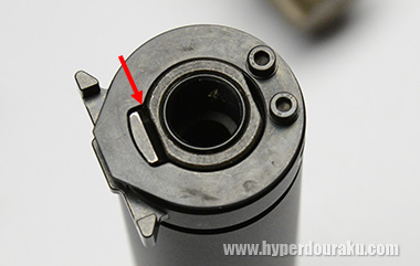 マズル部分もシンプルなデザイン。このマズル部分はねじ込み式のキャップになっており、取り外すことができる。