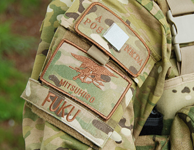 写真はIR識別パッチ付の血液型、ネイビーシールズパッチ、チーム3パッチ、アメリカ国旗などを装着している。