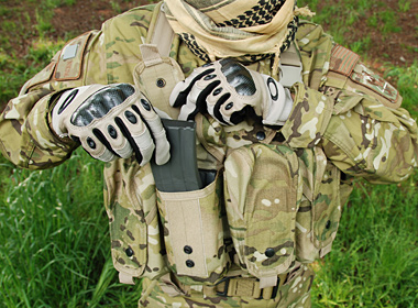 さて、マルチカムで悩むのがポーチ類をどのようにするか。従来のALICE装備であるピストルベルトとY形サスペンダーではせっかくのマルチカムがもったいない。
