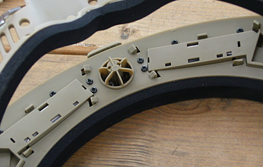 フェイスガードは取り外すことが出来る。5箇所の突起を内側からOリングで留めている。Oリングをなくさないように注意。