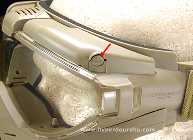 ゴーグル下面には通気孔がありファンをまわすとここから吸気されファンによって上方に空気が抜ける構造になっている。