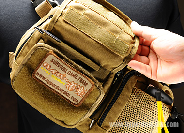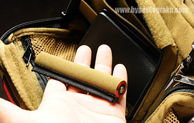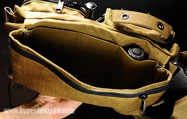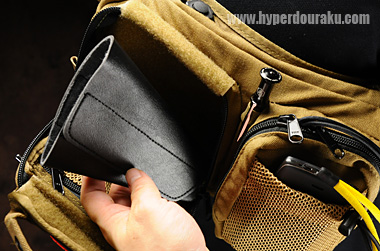そう、タクレットは本来、米国でコンシールドキャリー(銃を隠し持つ)のために作られたウエストバッグなのだ。こんなカンジでハンドガンを収納すことができる。ま、銃を持ち歩く文化のない日本では使わない機能なので、あくまで遊びの機能ということで考えたほうが良いだろう。トイガンを入れたまま街へ出かけて職務質問されたりしないように注意しよう(^_^;。