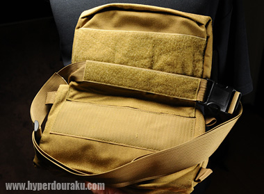 上部についている大き目のハンドルをグイッと前へ引っ張ると、ベリッとベルクロが外れ、ジッパーもそのまま開放される。これがタクレットの最も肝心な部分。非常に素早くポーチを開くことができる。