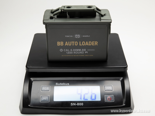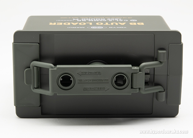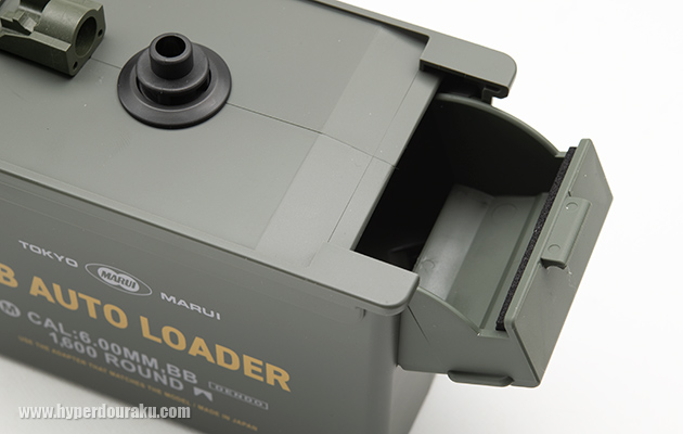 本体はODカラーの樹脂製で、米軍の弾薬箱(アモ缶)をイメージしたデザイン。表にはTOKYO MARUI、BB AUTO LOADER、CAL:6.00MM, BB1600 ROUNDなどがスタンプされる。横幅は140mm、高さは112mm