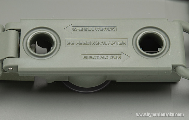 給弾口横にセットされているガスブローバックBアダプターは90度回して取り外す。BアダプターはガスブローバックAKシリーズに対応、またAアダプターに対応しているガスガンにも対応している。AとBでは少し形状が異なり、Aアダプターで給弾しにくい場合はBアダプターを使用してと取説にある。