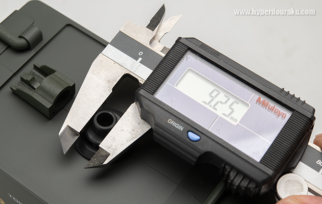 給弾口の外径は9.25mm。マルイの手動BBローダーと同じ径なのでこれまで市販されていたサードパーティ製アダプターも装着可能だ。なおノズル長は5.47mmだった。