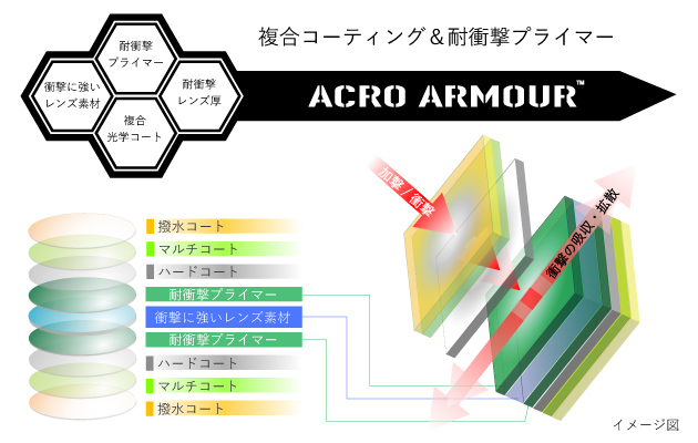 以前なら度付き耐衝撃レンズといえば「左右で4〜5万、フレーム込みだと6〜7万」にもなろうかという贅沢品だったものだが、アクロアーマーは同じ仕様がナント半額以下(!)なのだ。冒頭の野田 力さんのコメントにもあるように、「優れたコストパフォ―マンス」もアクロアーマーの特徴である。