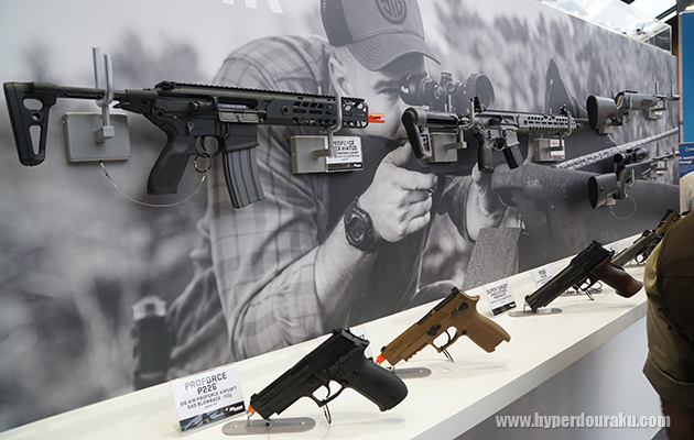 SIGは自社ブランドでエアソフト製品を展開している。IWAでもSIG SAUERブースの中に.22口径、.177ペレットや金属BBなどに混ざって6mmBBのエアソフトが展示されていた。