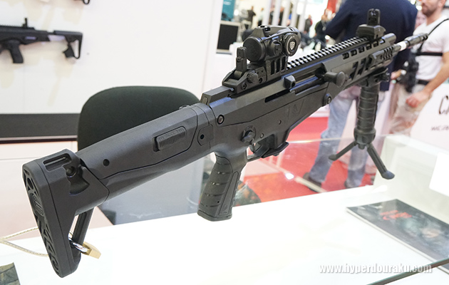 スライド、フレーム共に専用品でアンビのスライドリリース、アンダーマウントレール、樹脂製フォールディングストックを装備。こちらもAimpointのACRO P-1を搭載している。