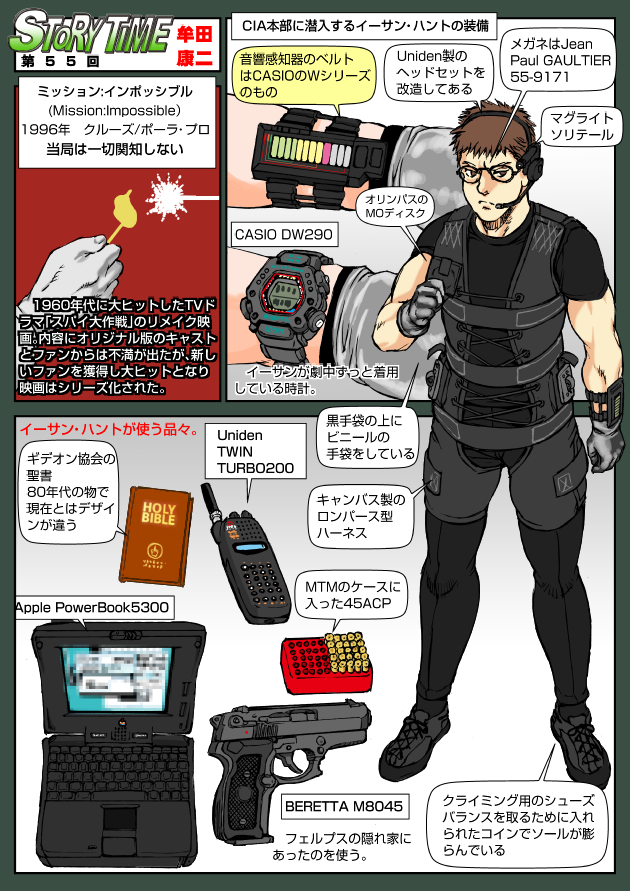 第55回は1996年公開の『ミッション:インポシブル』。1960年代に大ヒットしたTVドラマ「スパイ大作戦」のリメイク映画。内容にオリジナル版のキャストとファンからは不満が出たが、新しいファンを獲得し大ヒットとなり映画はシリーズ化された。