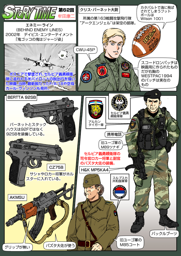 第62回は2002年公開、ジョン・ムーア監督作品の『エネミー・ライン』。ボスニアで撃墜され、セルビアの義勇親衛隊に追われる米パイロットの脱出行を描いた映画。当時、最新鋭だったF/A-18や空母カール・ヴィンソンも見どころ。