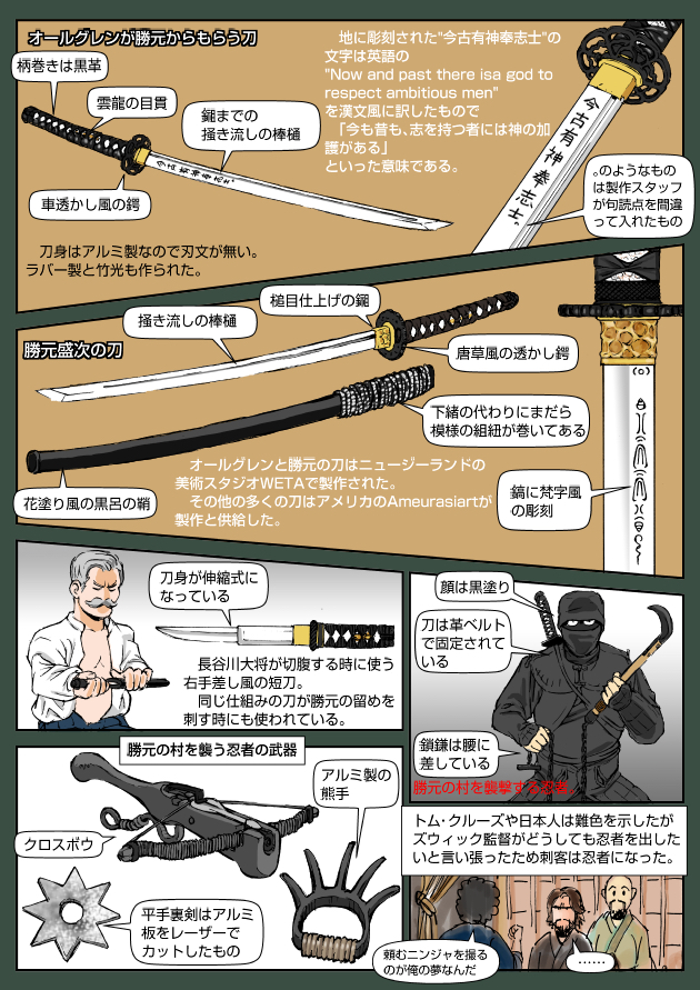 (2003年) トム・クルーズ演じるオールグレン大尉は南北戦争にて名誉と国のために命を賭けた英雄であった。しかし、戦争が終わり、時代の変化とともに、彼が戦った戦闘は今や過去のささやかな出来事に変わり果て、さまよえる男となっていた。 渡辺謙演じる勝元はサムライ一族の長であり、深く尊敬されている男だ。明治維新後の日本、押し寄せる近代化の波の中、勝元はサムライの時代の終わりを察知していた。しかし勝元は戦わずして去るつもりはなかった。 日本初の近代的軍隊を訓練する教官としてオールグレンを雇った時、二人の戦士の運命がひとつに重なる。 |