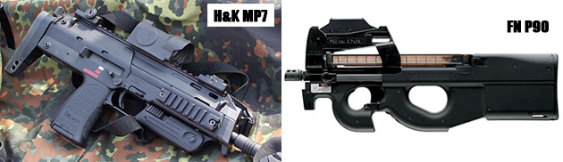 また、ドイツのH&K社が開発したMP7は4.6mm×30弾を使用する小口径かつ低反動のPDWで、重量約1.7kgと軽量、かつ光学照準器やウエポンライトを装着可能なピカティニーレールを標準装備する。