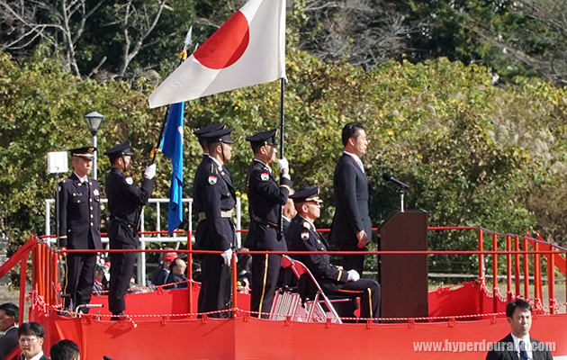 グラウンドで観閲行進と訓練展示が行われる。創立から続いている恒例行事だ。