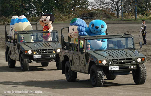 静岡県各市町村のご当地キャラ、ごてんばこめこ(御殿場市)、すそのん(裾野市)、金太郎(小山町)、オチャッピー(根本町)、シズラ(静岡市清水区)。登場順からすると県のゆるキャラのほうが市町村のキャラより序列が上なのだろうか。「ふじっぴーさん、さすがっす!」みたいな。