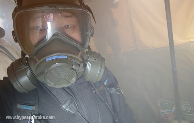 18式防護マスクの体験もできた。装着すると小銃の頬付けがしにくいとの話だったが、蚊取り線香を炊いたテント内で着用してみると、全く煙臭くない。これはちょっと感動。