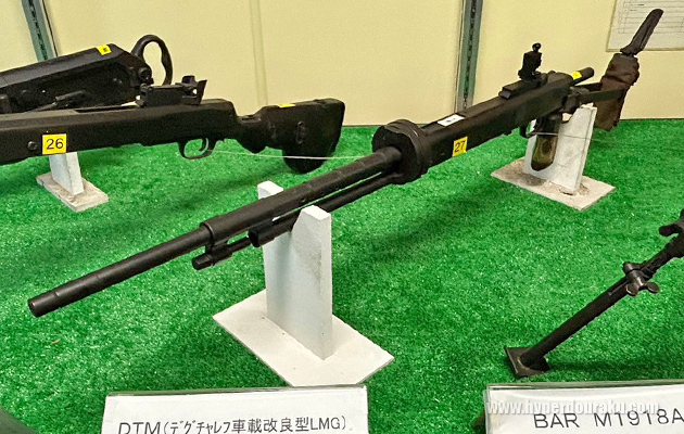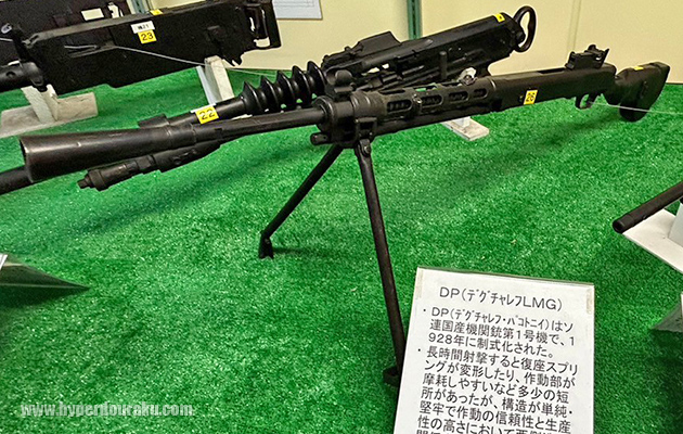 DP(デグチャレフLMG)。ソ連国産機関銃第1号機で、1928年に制式化された。長時間射撃すると複座スプリングが変形したり、作動部が摩耗しやすいなどの多少の短所があったが、構造が単純堅牢で作動の信頼性と生産性の高さにおいて西側造兵関係者を驚かした。口径7.62mm、47発円盤型弾倉、重量9kg。