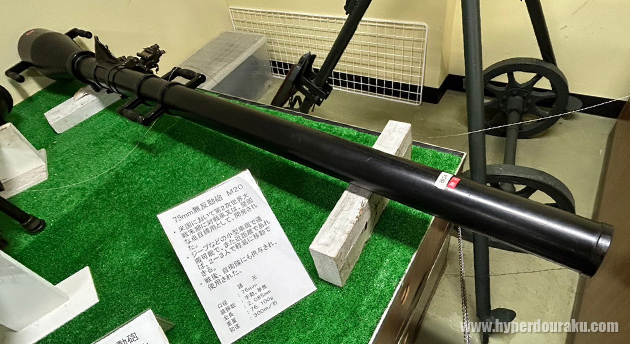 75mm無反動砲 M20。米国において第二次世界大戦末期に対戦車または堅固な点目標用として開発された。ジープなどの小型車両であれば、2~3人で軽易に移動できる。戦後、自衛隊にも供与された。