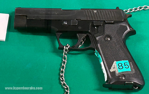 ミネベア 9mm拳銃。米軍から供与されたM1911A1、11.4mm拳銃の後継として、SIG SAUER P220をミネベア社がライセンス生産し、1982年に自衛隊で制式採用された。口径9mm、装弾数9発。