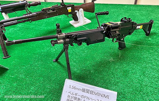 5.56mm機関銃MINIMI。ベルギーのFNハースタル社が開発した小型・軽量の軽機関銃で、自衛隊では兵セス5年から取得に着手した。発射速度を二段階切替できる。またリンクベルト給弾及び小銃用弾倉による給弾が可能。二脚を利用した射撃のほか、三脚に取り付けた射撃も可能。