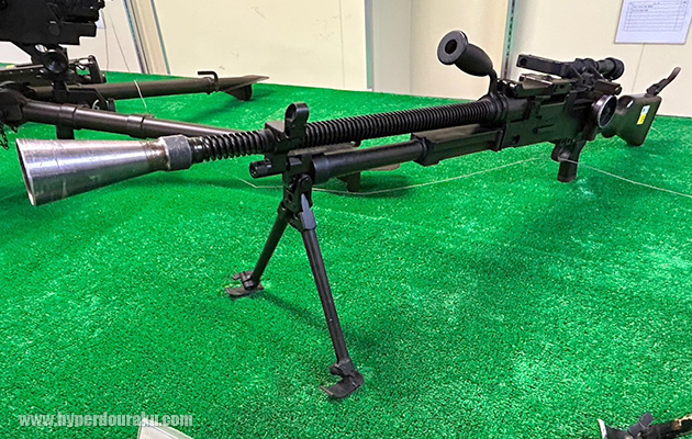 62式7.62mm機関銃。昭和29年から開発し、昭和37年(1962年)に制式化。日本人の体格に合わせM1919A1、A6より軽量に設計された。銃身は放熱効果を考慮されて羽根状で軽易に交換可能。二脚を使用するほか、三脚架にも取り付けることができる。口径7.62mm、ベルトリンク、重量10.7kg、毎分600発。