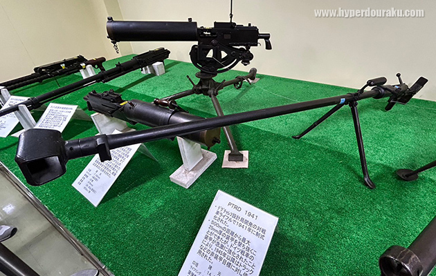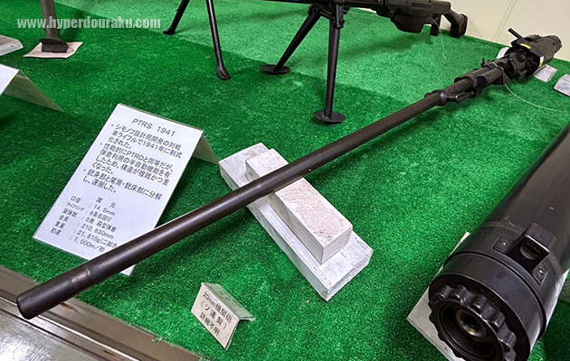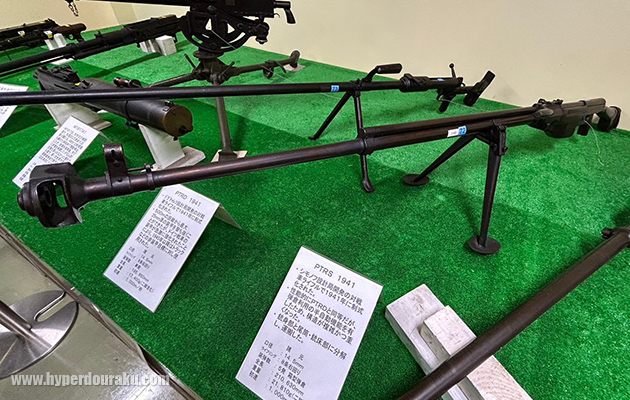PTRD 1941。ソビエト連邦デグチャレフ設計局開発の対戦車ライフルで1941年に制式化された。500mの距離から最大25mm厚の装甲を撃ち抜くことができたが、ドイツ戦車の装甲が急激に強化されたことにより、1945年以降はトラックなどの非装甲目標に対し使用された。