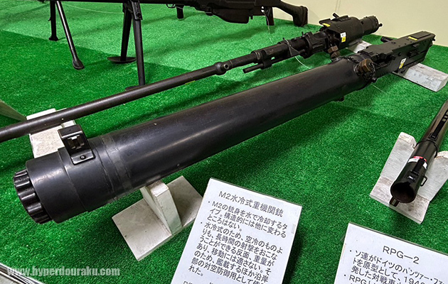 M2 12.7mm重機関銃。1920年に開発され、各種派生型はあるが、現在でも日本を含め、世界各国で使用されている。空冷式の重銃身タイプで最も多く使用されているもので地上の人員及び軽装甲車両もちろん、対空火器として航空機に対しても使用される。口径12.7mm、装弾数110発(金属製リンク)、重量38.2kg。