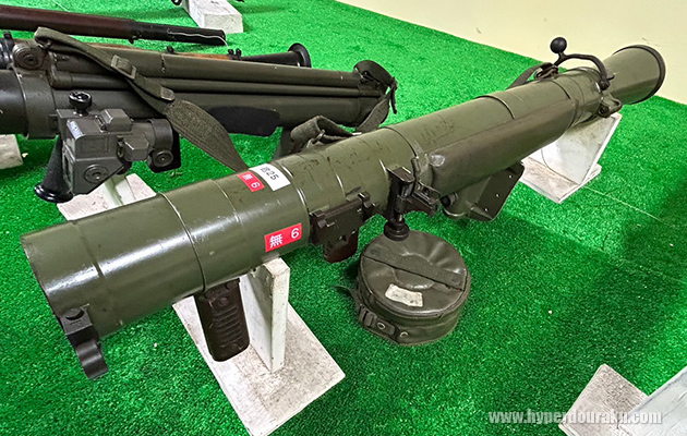 3.5インチ M20ロケットランチャー。一般には「バズーカ」の愛称で知られるアメリカの対戦車火器。朝鮮戦争後、それまでの2.36インチではT34戦車に対抗できず、開発が急がれ制式化された。操作容易なうえ、軽量・携行容易で高度の破壊力を持つロケット弾を発射することができ、自衛隊でも装備された。